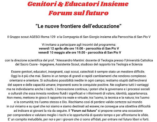 La Compagnia di San Giorgio ed il Gruppo Scout Agesci Roma 129 hanno organizzato una serie di chiacchierate sul tema delle nuove frontiere dell'educazione, con l'intervento di Don Alessandro Mantini.